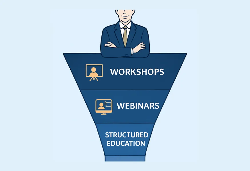 An authority-driven funnel that positions the advisor as a trusted expert through workshops, webinars, or structured educational sessions before inviting one-to-one conversations.